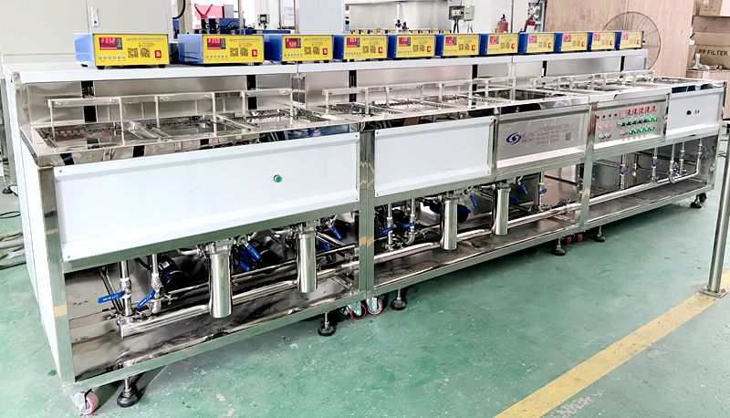 自動上料→洗劑超聲清洗→純水噴淋洗→純水超聲清洗→純水超聲清洗→自動下料。